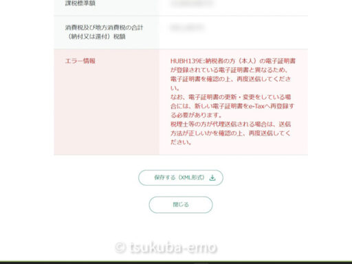 ・1月におこなった専従者分の[給与所得の源泉徴収票等の法定調書(及び同合計表)(地方提出用)]と、今回おこなった[消費税及び地方消費税申告]の申告結果がエラー(HUBH139E)となった。2025年にマイナカードの電子証明証を更新したことが原因でした。