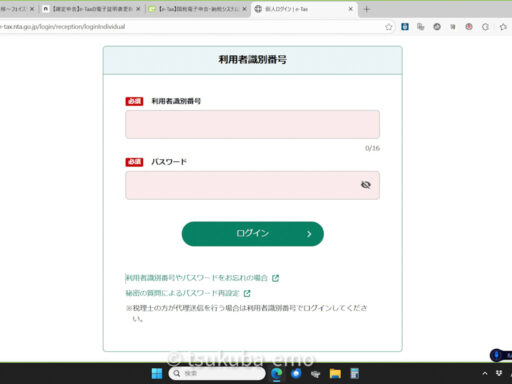 e-Taxにマイナンバーカードでログインをした場合、電子証明書の登録はできないため、利用者識別番号とパスワードでログインをしてください。