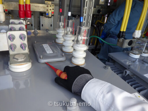 碍子側に手を添えて